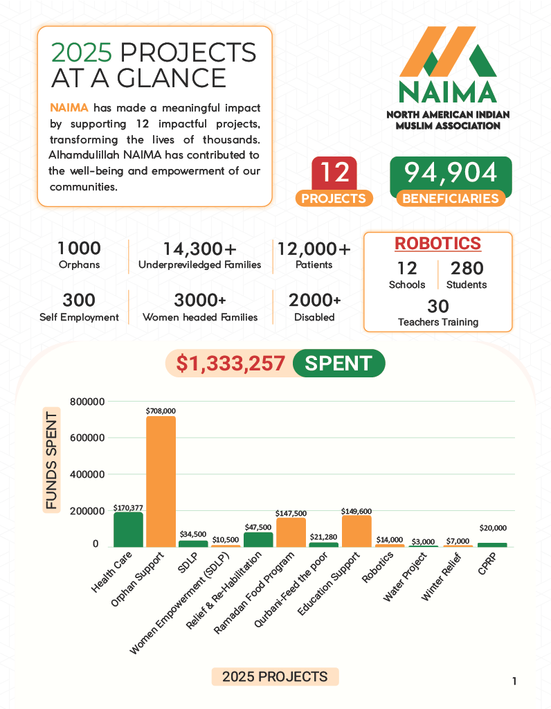 With the support of our community, North American Indian Muslim Association (NAIMA) impacted 94,904 lives in 2025 โ investing $1.3M+ across 9 major projects.